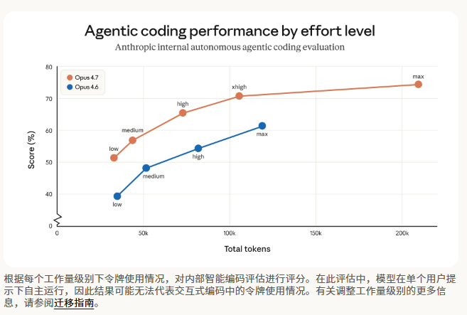 在 xhigh 和 max 等级下,Opus 4.7 会产生更多推理 token,尤其在 Agentic 场景的多轮对话中。