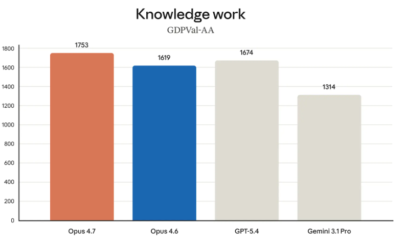 在第三方评测 GDPval-AA(覆盖金融、法律等领域的经济价值知识工作)以及 Finance Agent 评测中,Opus 4.7 均达到当前最优水平。