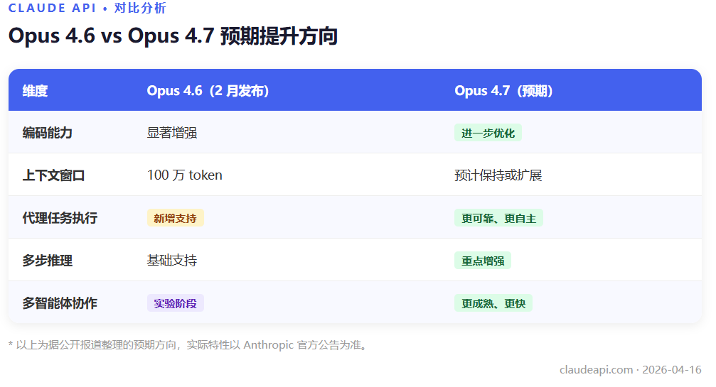 | 维度 | Opus 4.6(2 月发布) | Opus 4.7(预期) |