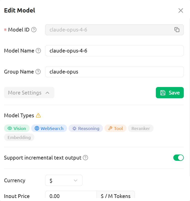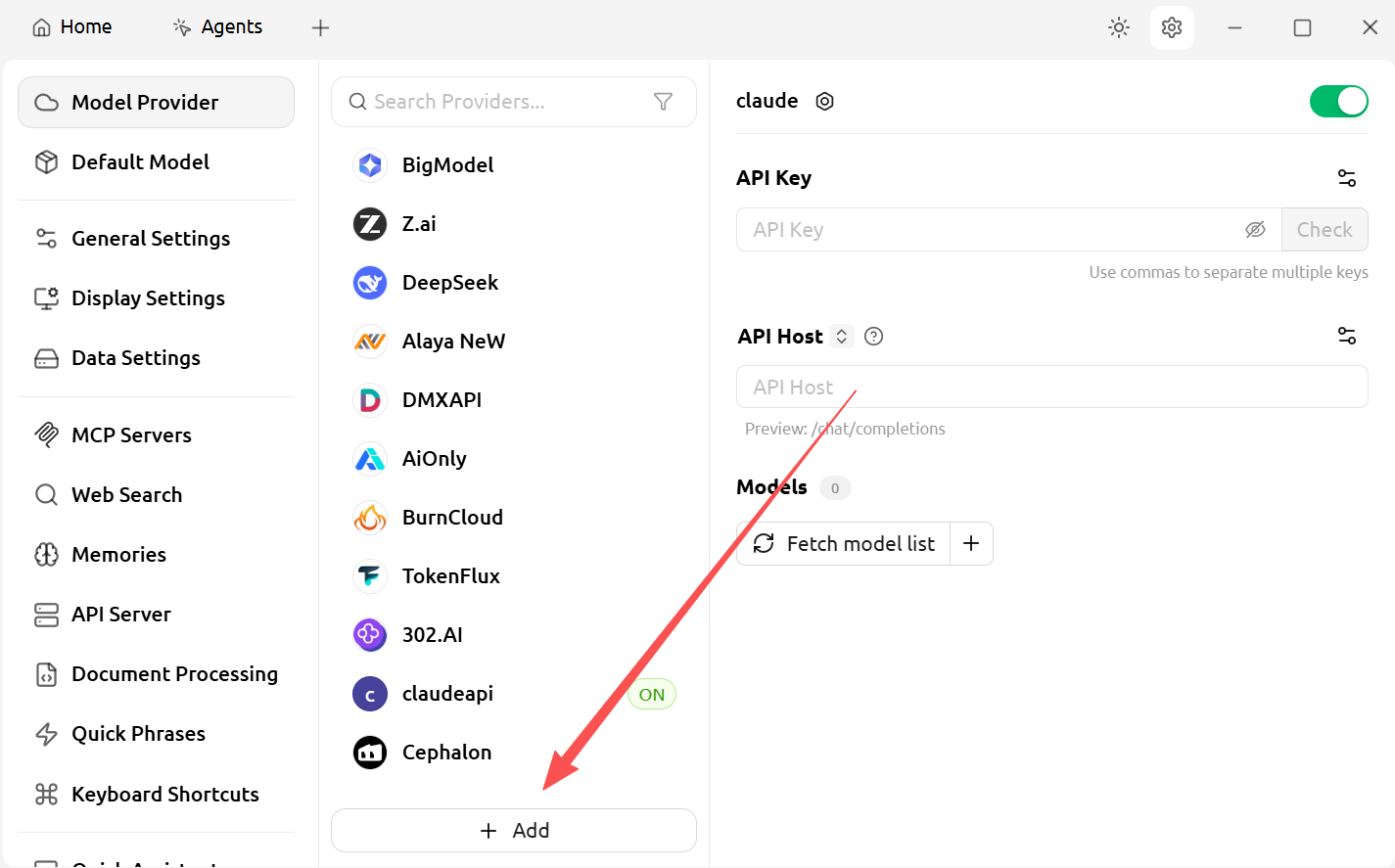 After adding a provider, you need to add models manually. In the provider settings, click “Add Model” and type in the model ID (e.g., claude-sonnet-4-6).