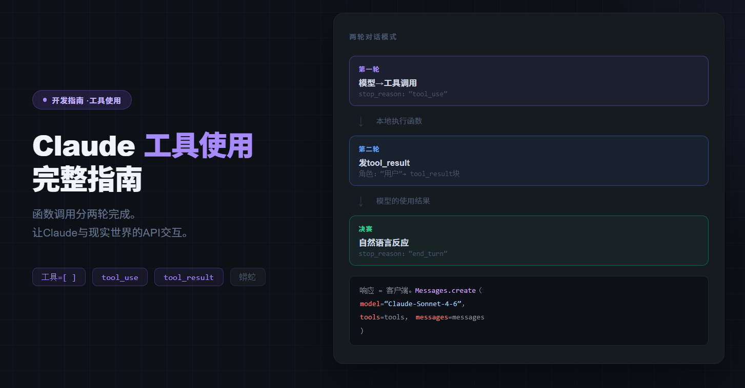 结论先说: Tool Use(工具调用)是让 Claude 从「只会聊天」变成「能干事」的核心能力。你定义好函数的名称、描述和参数格式,Claude 会自动判断什么时候调用、传什么参数——你只需要负责真正执行这个函数,再把结果送回给 Claude,它就能给出基于真实数据的最终回答。本文从单工具调用讲到多工具并行,再到实际业务场景,含三组完整可运行的 Python 代码。