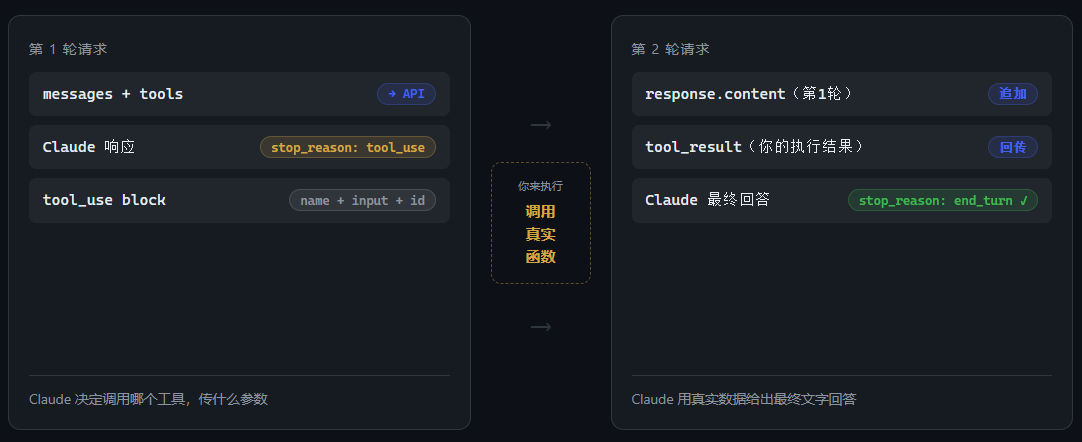 Tool Use 必须经历两轮:第一轮 Claude 返回 stop_reason: tool_use,你执行函数;第二轮送回 tool_result,才能拿到 stop_reason: end_turn 和最终文字。