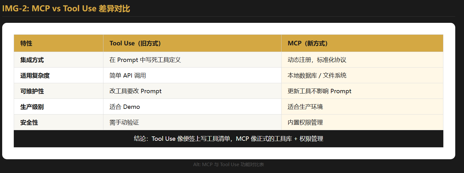 简单说:Tool Use 像在便签上写工具清单,MCP 像有一个正式的工具库和权限管理。