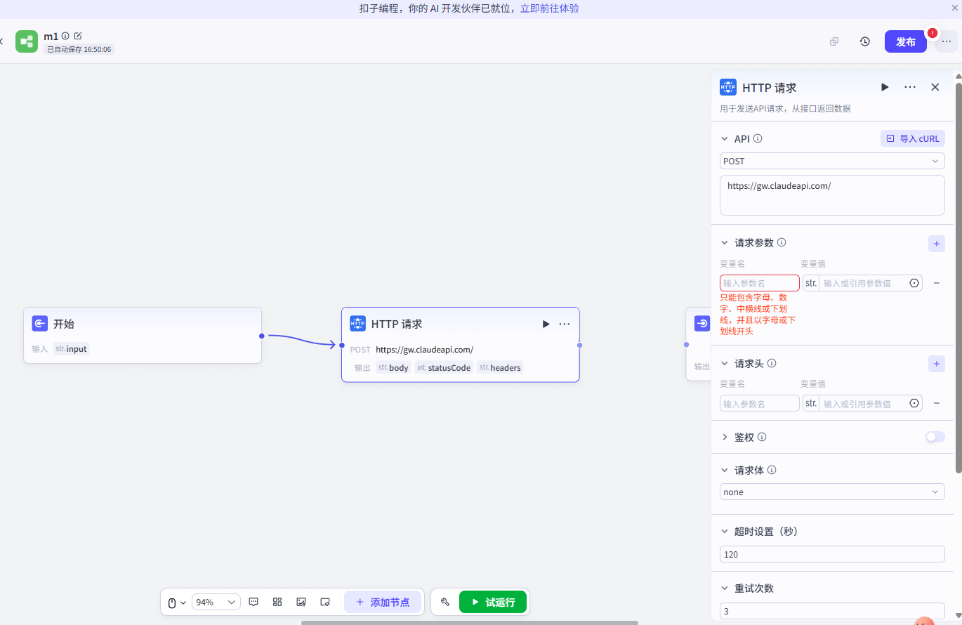 如果你需要在工作流中精确控制请求参数(如 system prompt、 temperature、最大 token 数),使用 HTTP 请求节点直接调用更灵活。