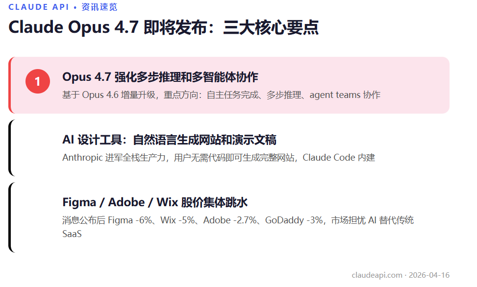 据 The Information 4 月 14 日独家报道,Anthropic 正在同时准备两个重磅产品:下一代旗舰模型 Claude Opus 4.7 和一款 AI 驱动的网站/演示文稿设计工具,最快本周发布。消息一出,Figma 股价当天暴跌 6%,Adobe、Wix 也跟着下挫。这到底是怎么回事?
