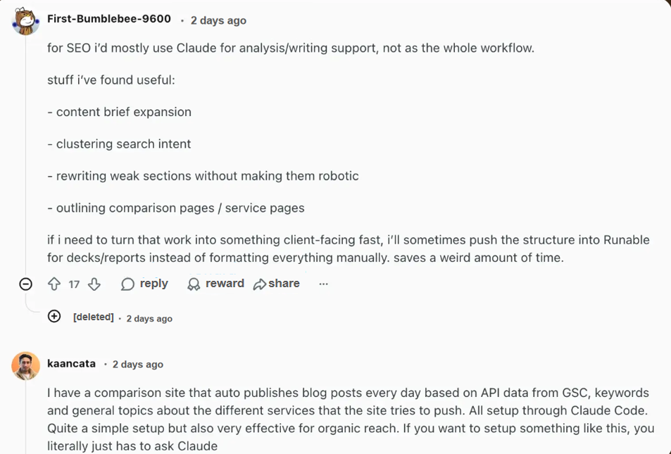 That shift says something important: Claude’s role in SEO is maturing. It’s no longer a novelty. Practitioners are treating it as a serious workflow component.