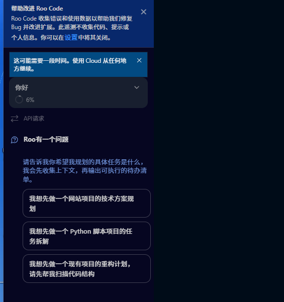 配置保存后,回到 Roo Code 对话框,发送一条测试消息: