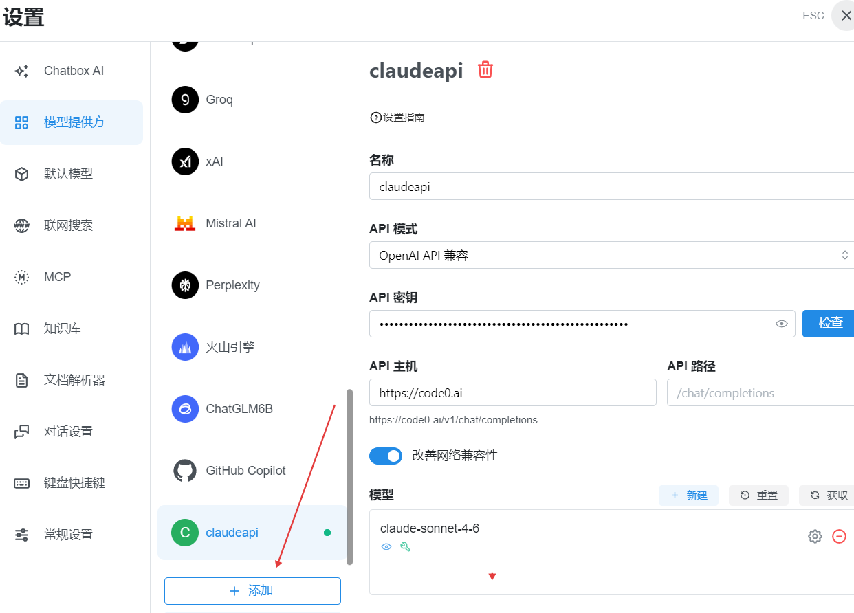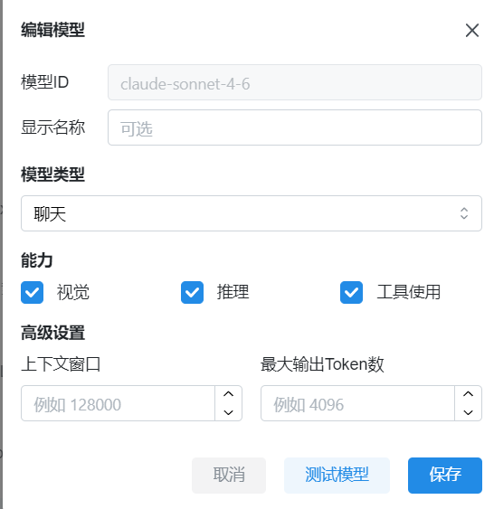 添加完服务商后,需要手动添加模型。在服务商配置中点「添加模型」,手动输入模型 ID(如 claude-sonnet-4-6)。
